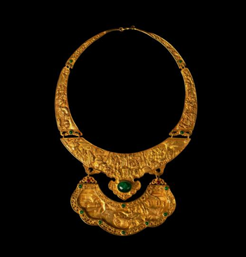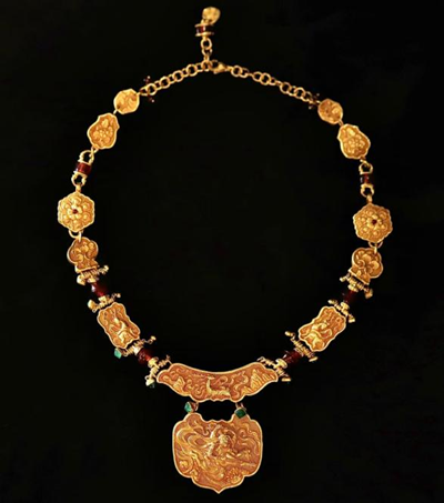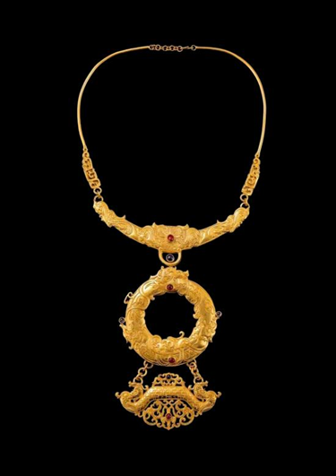 品名:敦煌印象 工艺:炸金珠工艺、錾刻浮雕工艺 材质:足金、玛瑙、红宝石、祖母绿