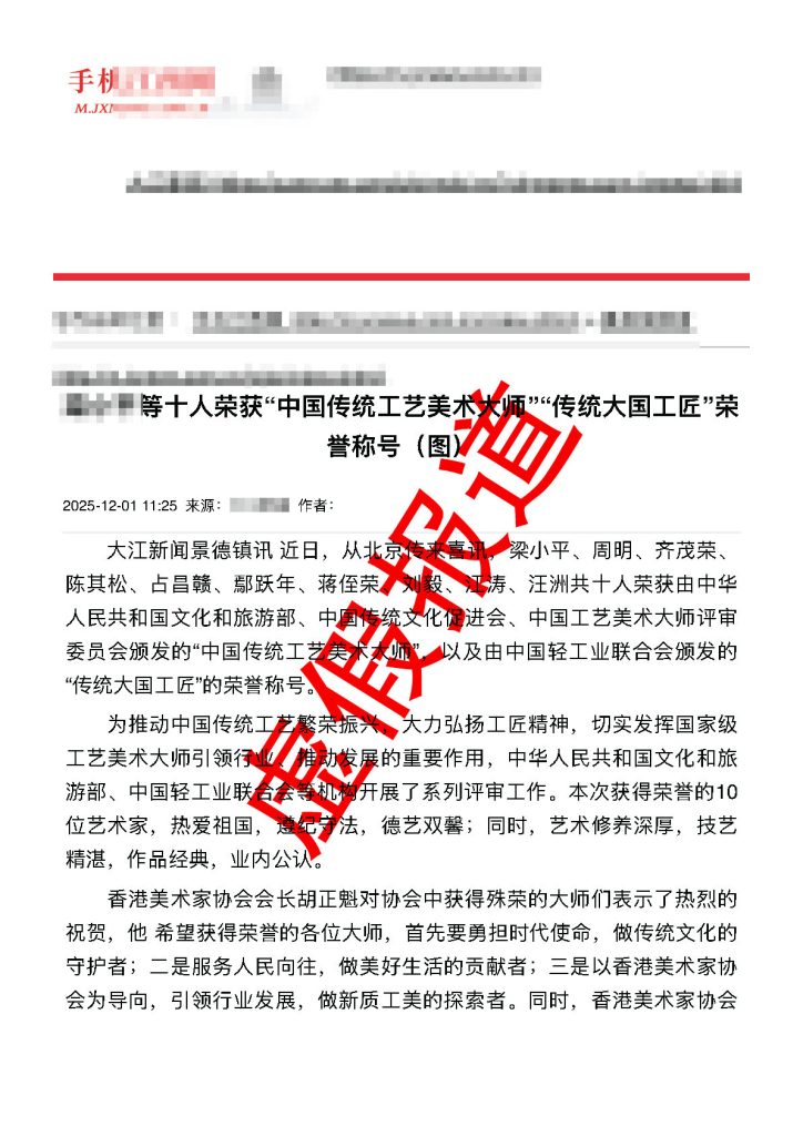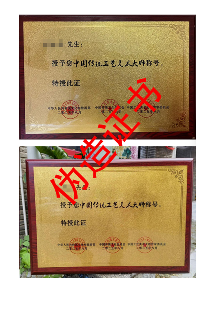 二、报道中提及的所谓“由中国传统文化促进会颁发的‘中国传统工艺美术大师’牌匾及相关印章”均系伪造,我会从未制作、颁发过此类牌匾和印章,相关伪造行为已涉嫌侵权。
