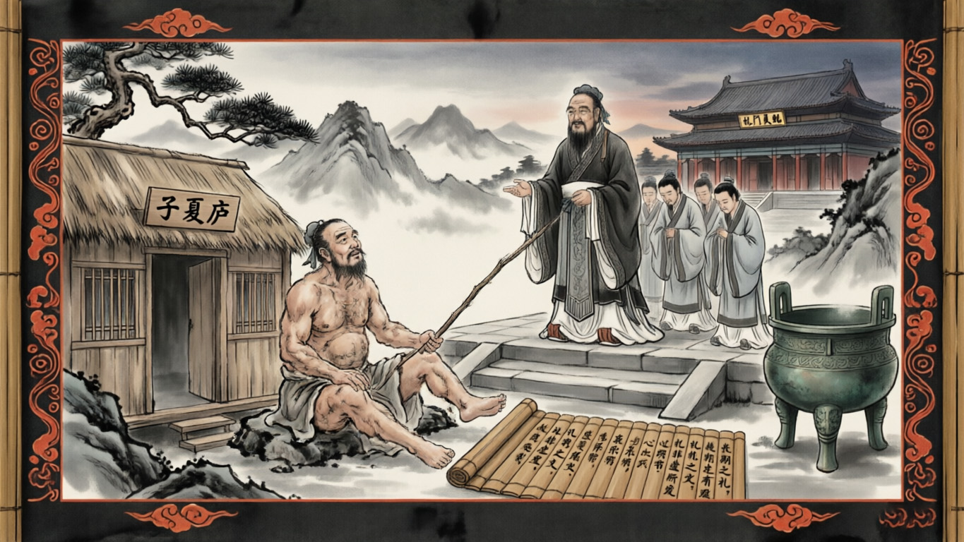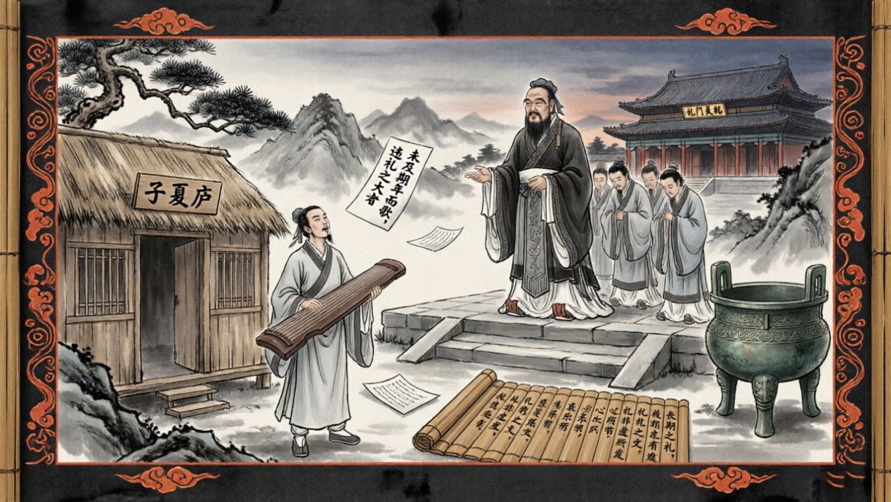 ● 子夏守礼之辨:子夏居母丧,未及期年而歌。孔子闻之不悦,曰:“先王制礼,过之者俯而就之,不至焉者跂而及之。今子夏哀未忘而乐已作,何其速也!”此事彰显孔子对礼之践履的严苛要求——礼非虚文,乃心之所发。