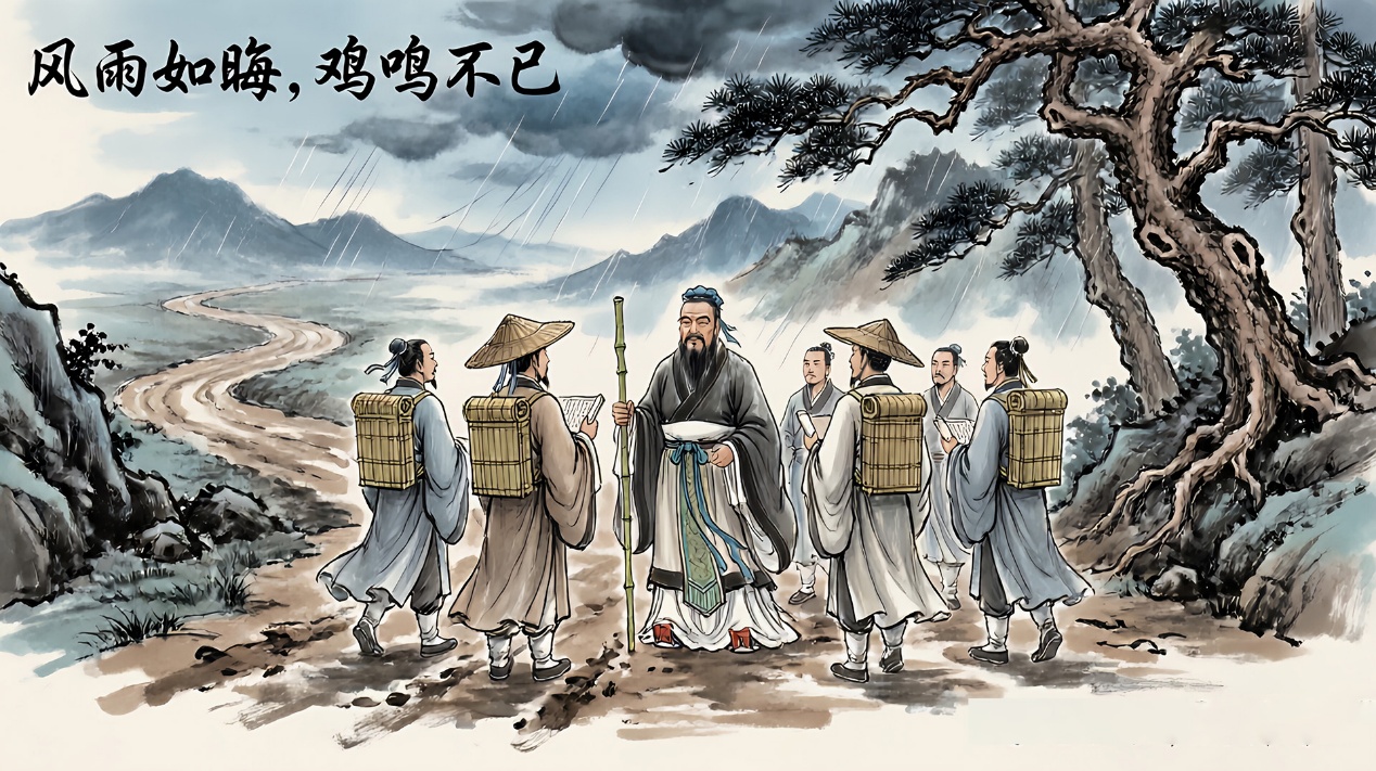 孔子五十五岁去鲁,率弟子周游列国,其行非为谋高位,实为践“道”之志。十四年间,足迹遍卫、陈、宋、蔡、楚,所遇唯困厄与冷眼。在宋,司马桓魋欲杀之,弟子惧,孔子从容道:“天生德于予,桓魋其如予何?”在陈蔡之间,绝粮七日,弟子有愠色,孔子仍弦歌不辍,以“君子固穷”自持。当子路愤懑:“君子亦有穷乎?”孔子答:“君子固穷,小人穷斯滥矣。”此“知其不可而为之”的精神,正是儒家“士志于道”的铮铮风骨。他并非不知理想难行,却以行动诠释“道高于势”的信念。例如,面对叶公问政,他主张“近者悦,远者来”;对子路问政,则强调“先之劳之,无倦”。其政治理想始终以“仁政”为核心,主张以德化民而非暴力压服。晚年归鲁,虽未得位,却删订六经,以文化传道统。其一生,如《易传》所赞:“天行健,君子以自强不息”,在现实的挫败中,完成了精神的超越。