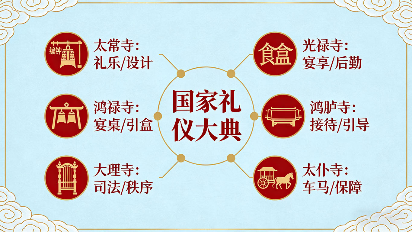 当我们在史书中读到“鸿胪寺卿”时,脑海中往往会浮现出一位身着朝服、引着外国使节步入大殿的官员形象。鸿胪寺,这个负责外交与朝会仪节的机构,无疑是古代国家礼仪最外显的“门面”。然而,一场足以载入史册的国家大典,其背后所依赖的,远非一个机构所能支撑。它更像一场宏大而精密的交响乐,需要多个部门的无缝协作。今天,就让我们将目光从鸿胪寺移开,去探寻那些在幕后默默支撑起“礼仪之邦”威严与秩序的另外两个关键角色——太常寺与光禄寺。