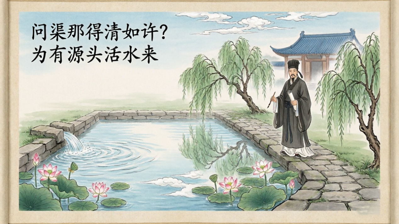 朱熹一生嗜学重教,流传最广的便是 “朱子劝学”与“半亩方塘”的故事。他晚年居于福建考亭,筑堂讲学,常以自然景象喻为学之道。一日观方塘活水,有感而发,写下“问渠那得清如许?为有源头活水来”的千古名句,以池水清澈比喻心性澄明,以源头活水喻指不断学习、日新其德的修身路径,既道出为学的真谛,也将理学“格物穷理、日进不息” 的精神融入诗意之中。他为官之时,每到一处便兴教化、劝农桑,以言传身教践行儒家“为政以德”的理念,百姓感其恩德,流传下诸多朱子体恤民情、敦化风俗的美谈。