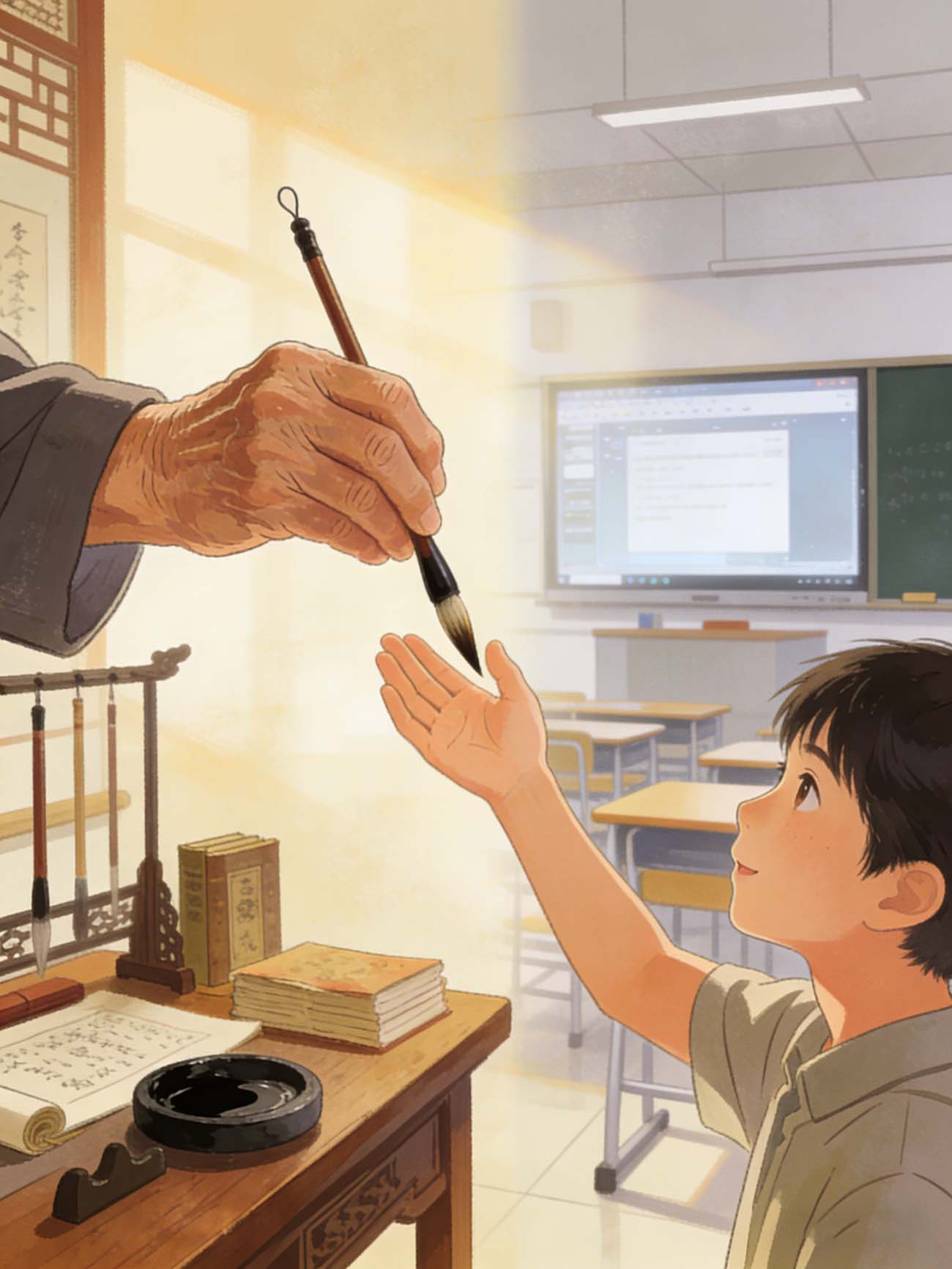 [插图提示词:左侧展示王羲之《兰亭序》的局部放大图,突出“飞白”笔法的细节;右侧展示黄公望《富春山居图》的局部,突出“披麻皴”的线条质感。中间用一条流动的水墨线条将二者连接,象征书画线条的共通性。]